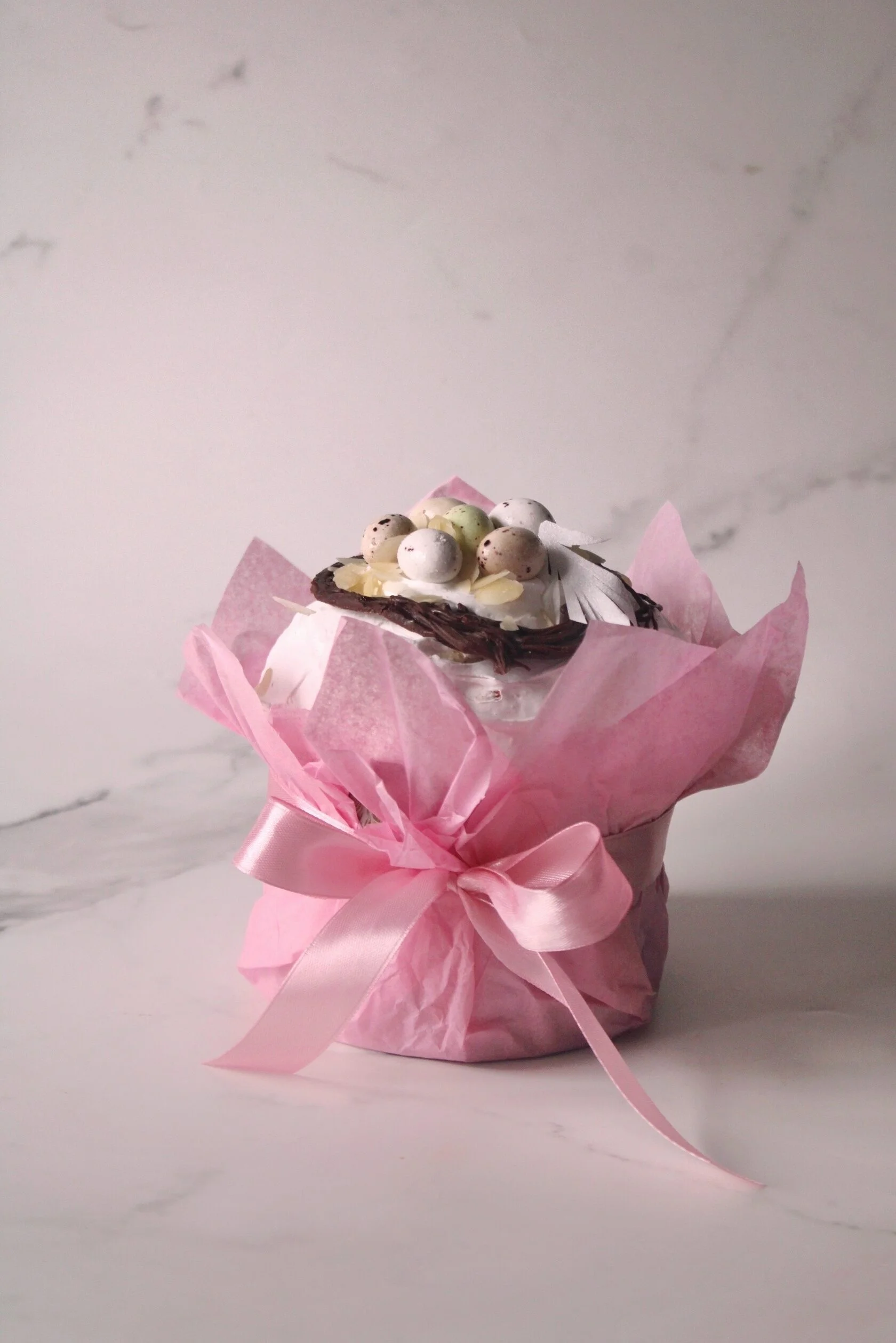 Состав: Мука пшеничная, сахар ,соль, желток,творог 9%, масло сливочное 82,5%, дрожжи живые, фисташковая паста, катаифи,сгущенное молоко цельное, глазурь маршмеллоу, гнездо из темного бельгийского шоколада, яйца драже, вафельные перья, миндальные лепестки.