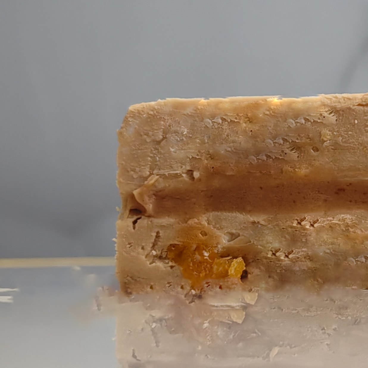 Благодаря высокому содержанию жирных сливок (33%) и сливочного масла (82,5%), мякиш приобретает бархатистую, слегка влажную текстуру, напоминающую плотный творожный мусс. Варёная сгущёнка придаёт тесту глубокий карамельный оттенок и нежную тягучесть, а вкрапления белого шоколада создают деликатные сладкие акценты. Кусочки натуральной кураги вносят необходимый баланс — лёгкую кислинку, которая оттеняет сливочную сладость и не даёт куличу стать приторным